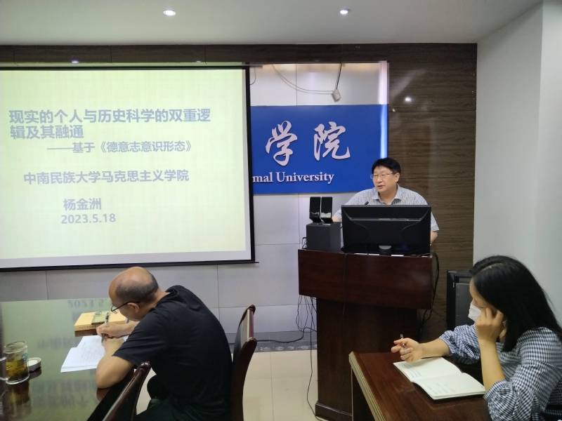 为进一步提升必赢bwin网页版教师的马克思主义理论素养,2023年5月18日下午,中南民族大学必赢bwin网页版院长杨金洲教授应邀来校,在致远楼305室作了题为《现实的个人与历史科学的双重逻辑及其融通——基于<德意志意识形态>》的学术报告。本次报告会由必赢bwin网页版副院长夏慧教授主持,学院全体教师参加。