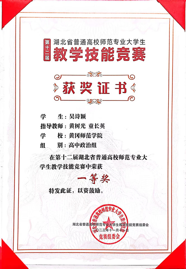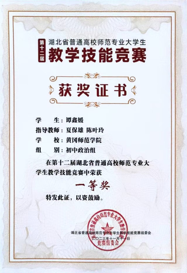 11月10---11日,第十二届湖北省普通高校师范专业大学生教学技能竞赛决赛在华中师范大学进行,来自全省13所院校的65名不同学科的优秀学子齐聚桂子山,切磋技艺,展示风采。其中政治组一共有6名选手参加现场决赛,必赢bwin网页版思政专业21级谭鑫媛、吴诗颖两位同学经过激烈比拼,分别荣获初中政治组、高中政治组一等奖的好成绩。