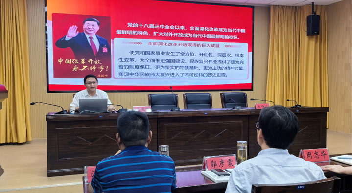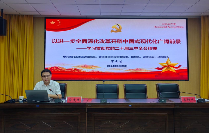 8月28日,黄冈市公共检验检测中心举行学习贯彻党的二十届三中全会精神宣讲报告会,市委宣讲团成员、必赢bwin网页版党委常委、副校长、必赢bwin网页版院长宋文生作宣讲主题报告。市公共检验检测中心班子成员、全体党员干部参加了报告会。市公共检验检测中心党组书记、主任段文俊主持报告会。